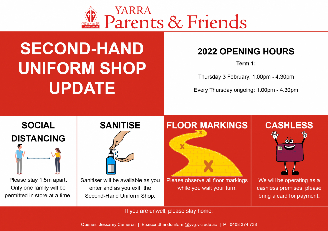 Yarra Parents & Friends run the Second-Hand Uniform Shop. It is located in the back of School House.