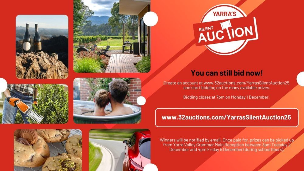 Carols@Yarra Postponed – But the Silent Auction Is Still On! After exploring every possible alternative, we’ve made the tough call to postpone Carols@Yarra to next December. The recent rain has left the oval far too wet for the stage and picnic rugs, and with more rain forecast, even clear skies on Monday wouldn’t give the ground time to recover. But here’s the great news – the Silent Auction is still live and closes at 7.00 pm this Monday! Thanks to the generosity of our Yarra community, there are some incredible items on offer – perfect for snapping up a bargain Christmas gift. Don’t miss out! Visit www.32auctions.com/YarrasSilentAuction25 to place your bids. And the really exciting news? Carols@Yarra will return next December as part of Yarra’s 60th anniversary celebrations – and we’re already planning to make it bigger, brighter and better than ever. We wish all of our YOGs a very Merry Christmas, as you celebrate with friends and family!