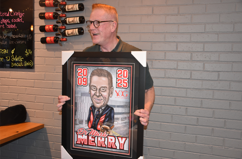 A Farewell with Character: YOGs Honour Dr Mark Merry In December, the Yarra Old Grammarians committee celebrated the retirement of Dr Mark Merry, thanking him for 17 years of exceptional leadership as Principal. His time at YVG was marked by vision, growth and a deep commitment to the Yarra Spirit. As a token of appreciation, the YOGs presented Dr Merry with a WEG-inspired caricature, featuring his beloved cat Puth and the newest addition to the campus - the Performing Arts & Media School, now proudly named in his honour. This unique gift captured both his personal and professional legacy. On behalf of all YOGs, we extend our heartfelt thanks and best wishes to Dr Merry for the next chapter ahead.