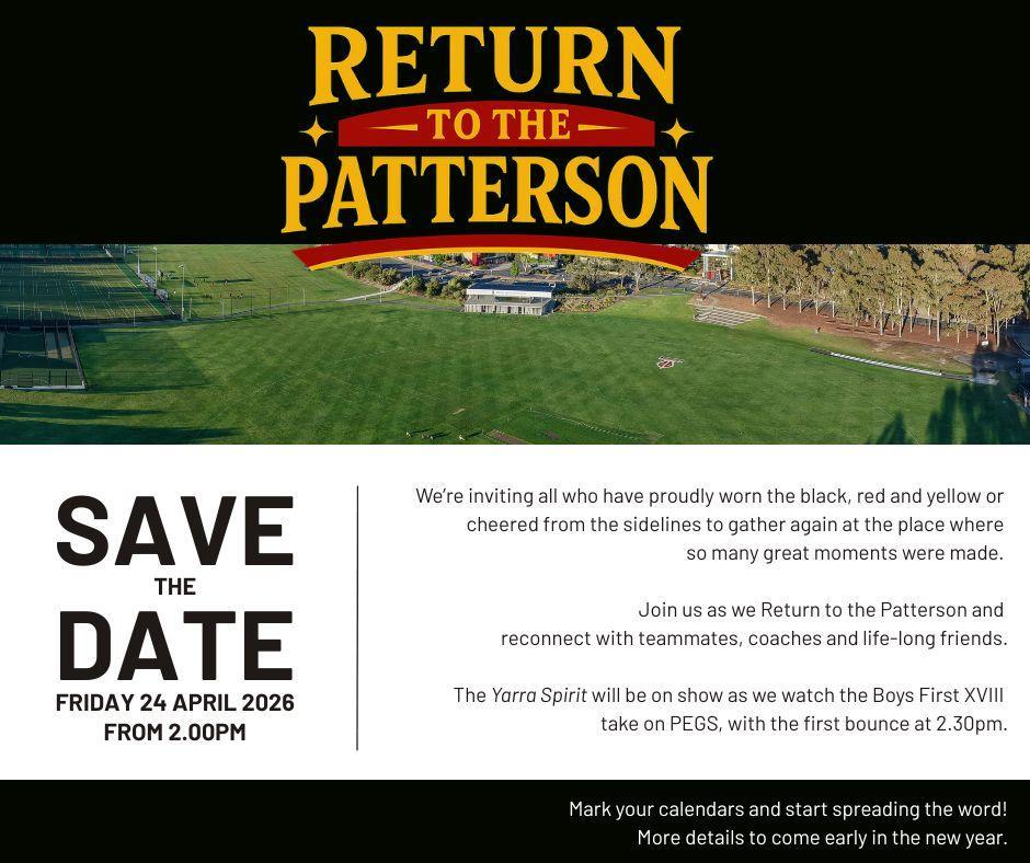Save The Date: Return to the Patterson We’re excited to let you know that a new alumni platform, YOG Connect, is on the way! This platform will make it easier for you to connect with other YOGs, stay up to date with news and events, and celebrate the achievements that make our community special. It’s all about bringing us closer together and creating more ways to engage. Keep an eye on your inbox - we’ll send you details soon, including how to get started. We can’t wait to share this with you and see the positive impact it will have on our YOG network. Thank you for being part of this journey. Together, we’re building a stronger, more connected Yarra Old Grammarian community.